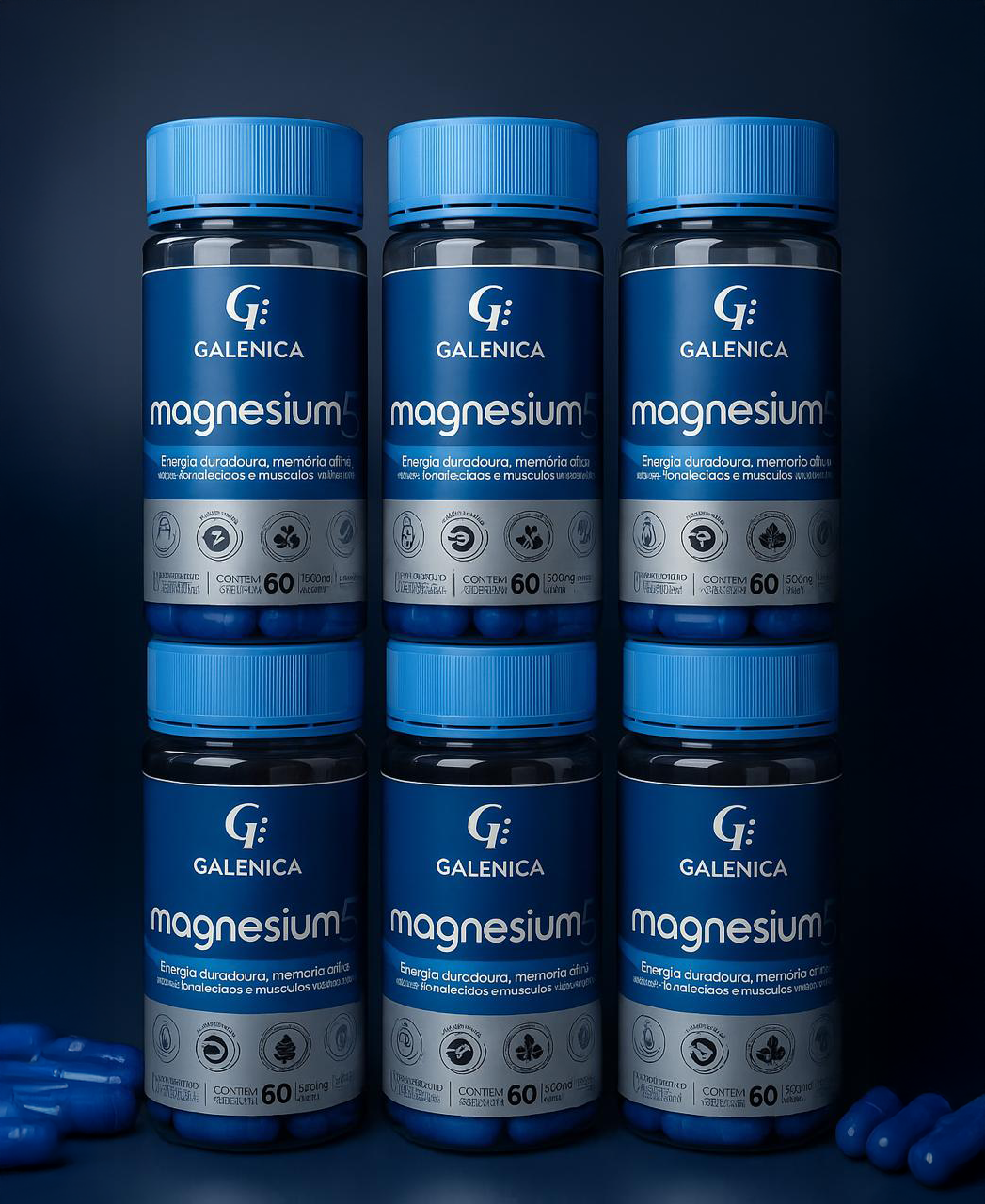 O Magnesium 5 da Galenica é um Suplemento Premium desenvolvido com cinco formas biodisponíveis de magnésio, cuidadosamente equilibradas para oferecer absorção superior e ação completa no corpo e na mente.