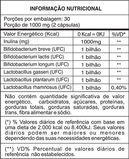 INGREDIENTES: Inulina, Bifidobacterium breve, Bifidobacterium lactis, Bifidobacterium longum, Lactobacillus gasseri, Lactobacillus plantarum, Lactobacillus rhamnosus.
