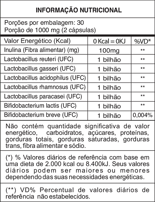 INGREDIENTES: Inulina (Fibra alimentar), Lactobacillus reuteri, Lactobacillus gasseri, Lactobacillus acidophilus, Lactobacillus rhamnosus, Lactobacillus paracasei, Bifidobacterium lactis, Bifidobacterium breve.