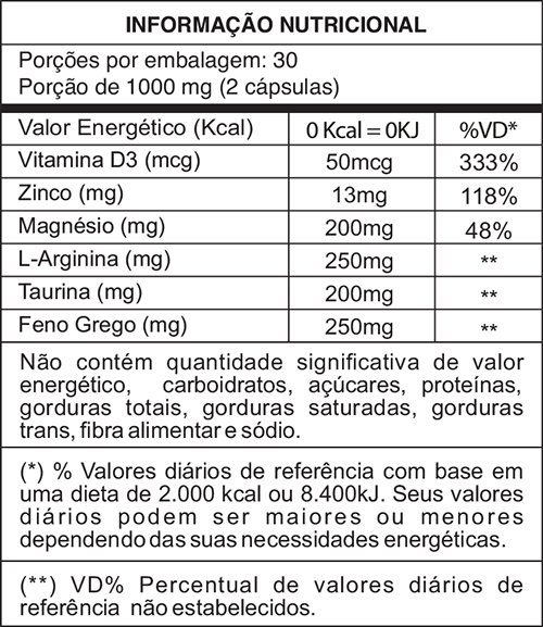 INGREDIENTES: Vitamina D3, Zinco, Magnésio, L-Arginina, Taurina, Feno Grego, Excipiente QSP.